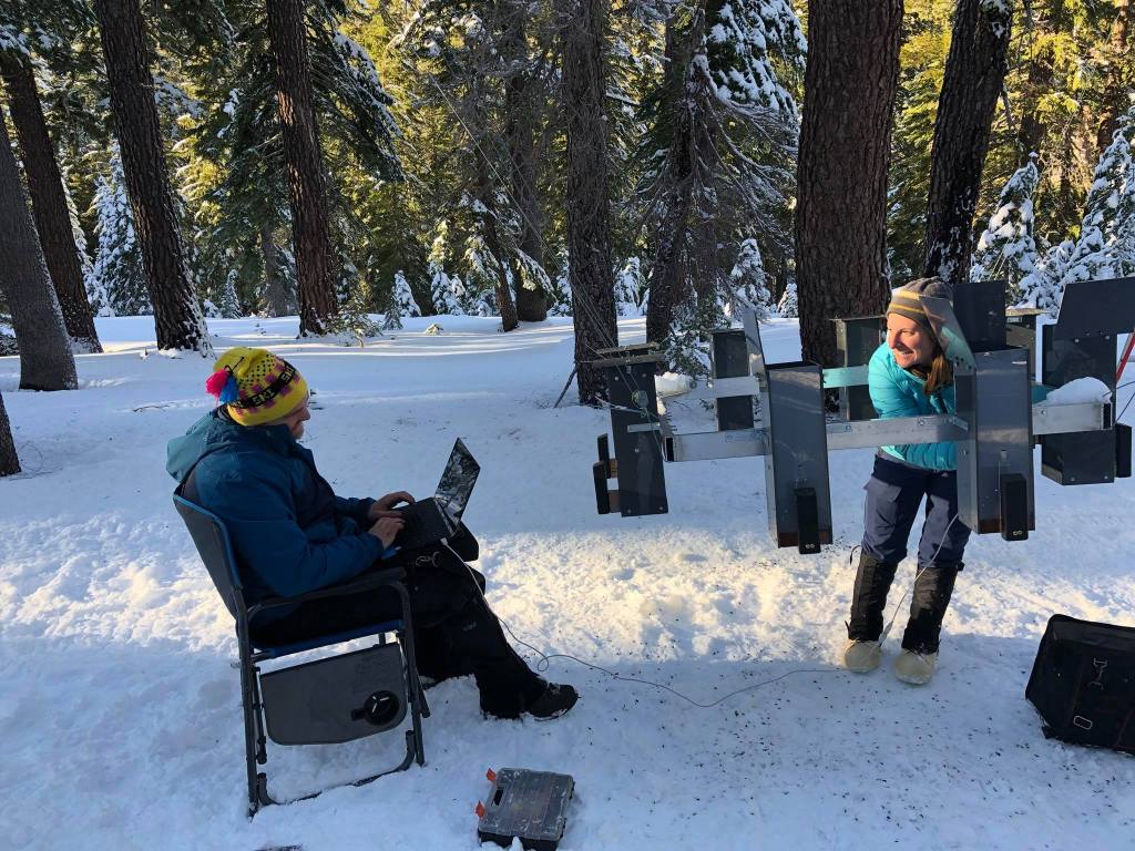 At our long-term field site in the Sierra Nevada mountains (collaboration with Dr. Vladimir Pravosudov at the University of Nevada, Reno), we study spatial cognitive abilities in free-living mountain chickadees (Poecile gambeli). Using innovative ‘smart’ feeder arrays we are able to program individuals to a single feeder within the array and assess their learning and memory performance (Croston et al. 2016, 2017; Tello-Ramos et al. 2018, Animal Behaviour). We assess cognitive ability along an elevation gradient, where selection pressures on overwinter survival increase with elevation (Branch et al. 2019; Benedict et al. 2020, Behavioral Ecology and Sociobiology). Mountain chickadees are nonmigratory, food-caching birds that store thousands of food items throughout their territories during times when food is abundant, to consume later when food is scarce. These birds use their specialized spatial memory abilities to recover their food stores and survive the harsh montane winters. Our research shows that birds inhabiting higher, harsher elevations perform significantly better on our spatial task compared to their lower elevation counterparts.