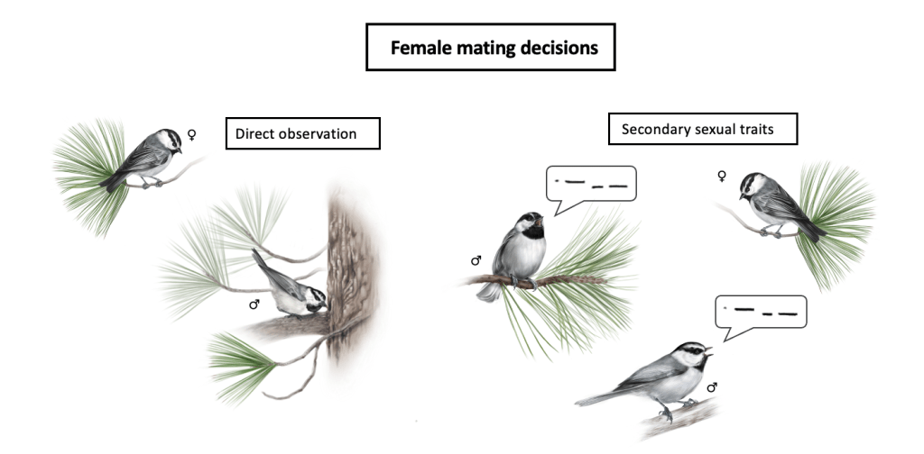 We’ve shown that they can discriminate among high and low elevation males (Branch et al. 2015, Animal Behaviour), and that song (Branch & Pravosudov 2015, Royal Society Open Science; 2020, Behavioral Ecology and Sociobiology) and plumage (Lane et al. in prep) vary between high and low elevation males. Currently, we are working to assess whether females choose extra-pair mates based on their cognitive abilities and whether or not that information is conveyed via secondary sexual traits.