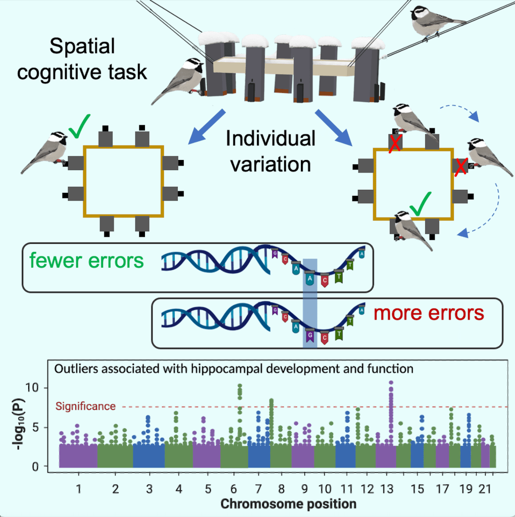 Recently, we’ve shown that selection is acting on the cognitive abilities of these small birds. Individuals that perform better on our spatial cognitive task are more likely to survive their first winter and into the breeding season (Sonnenberg et al. 2019, Current Biology). We’ve also shown that females increase their reproductive investment when their social mate has better spatial cognition (Branch et al. 2019, Ecology Letters). Furthermore, in collaboration with Drs. Georgy Semenov and Scott Taylor at the University of Colorado, Boulder, we’ve shown that variation in spatial cognition is associated with differences in the genome, known to be related to neuron growth and development (Branch et al. 2022, Current Biology).
